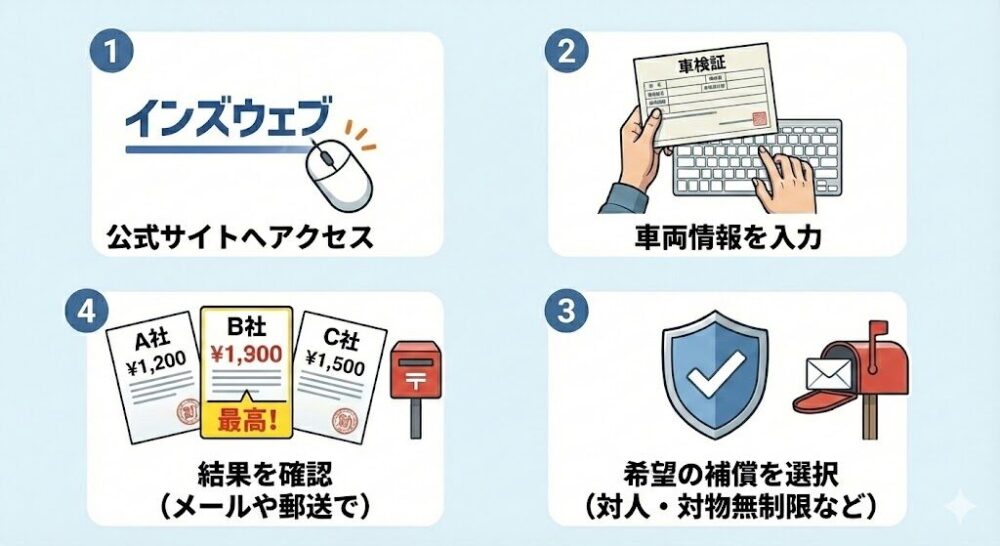 正直に言えば、ネット完結の「ダイレクト型保険」は黒ナンバーの引き受けを断ることが多いです。だからこそ、複数の「代理店型損保」を一気に比較して、その中で最も割引率が高いプランを見つけ出せる「インズウェブ」が、黒ナンバー保険における「最短ルートの正解」になるのです。