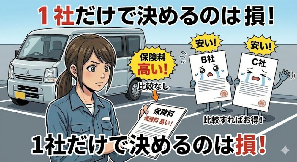 これが最大の失敗です。黒ナンバー保険は、保険会社によって「40代以上に強い」「20代でも比較的安い」など、得意な属性が全く異なります。比較をしないのは、数万円をドブに捨てているのと同じです。