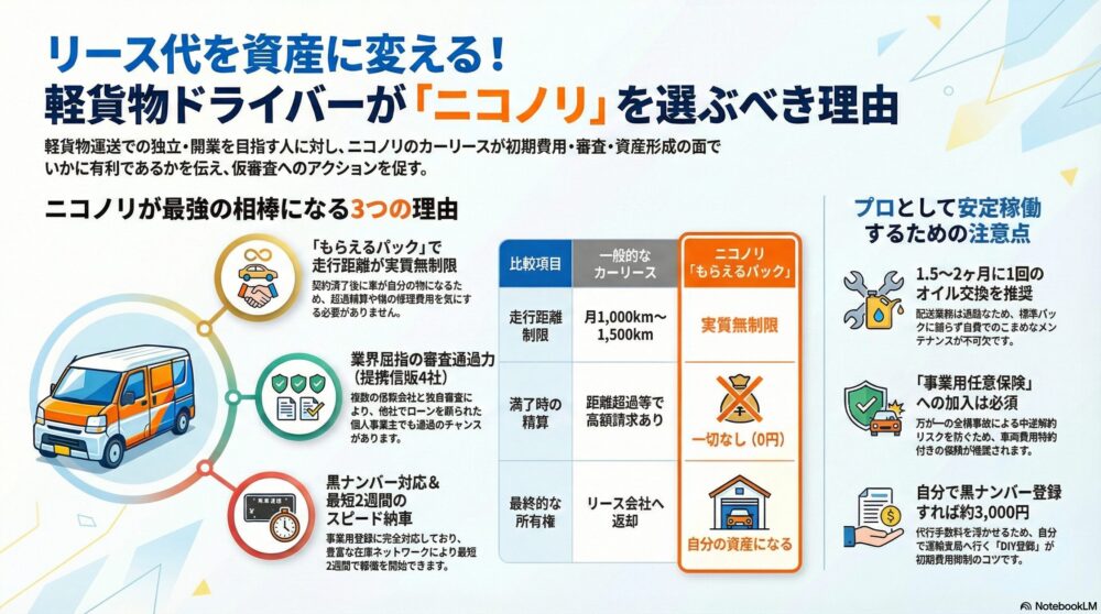 いかがでしたでしょうか。ニコノリの「もらえるパック」は、軽貨物ドライバーにとって以下の三拍子が揃った最強の開業ツールです。