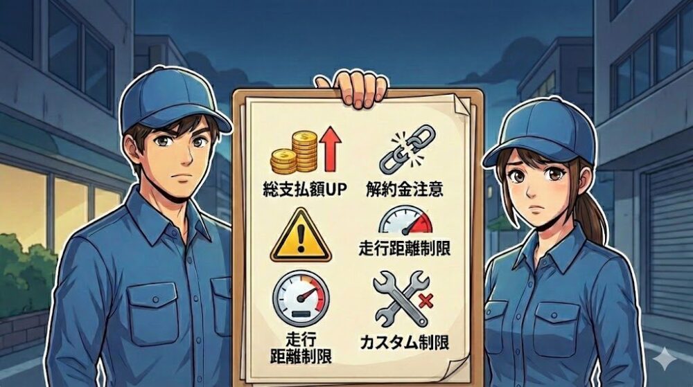 カーリースは原則として、契約期間中の解約ができません。 もし「軽貨物を始めてみたけど、3ヶ月で辛くて辞めた」となった場合、残りの期間のリース料を一括請求されるなど、高額な違約金が発生します。 「とりあえず試しにやってみようかな」という軽い気持ちで契約するのは危険です。