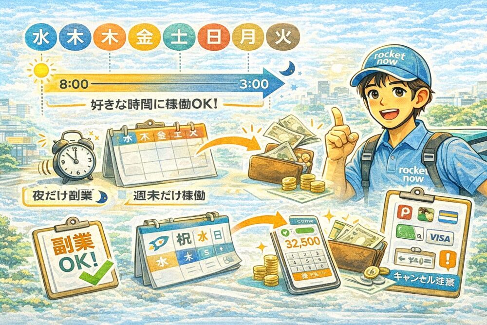 ロケットナウ配達員の働き方(稼働時間・支払い・注意点)