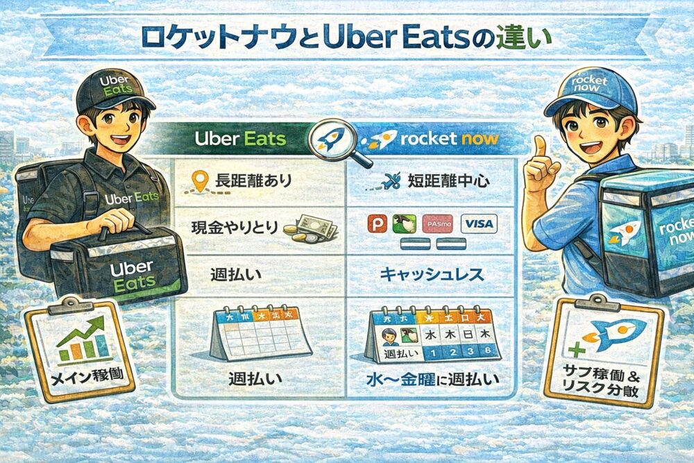 ロケットナウは「短距離配達が中心になりやすい設計」で、長距離で消耗しにくいのが魅力と言われます。また、現金対応が不要(キャッシュレス)なので、釣銭準備や現金トラブルの不安を減らしやすいのもポイントです。