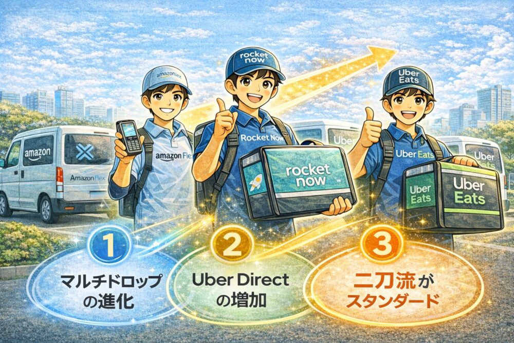 「 Amazon Flex、ロケットナウ(rocket now)、そしてUber Eats。これらを「同時オンライン」にして、最も期待値の高い案件を選ぶのが2026年のスタンダードです。