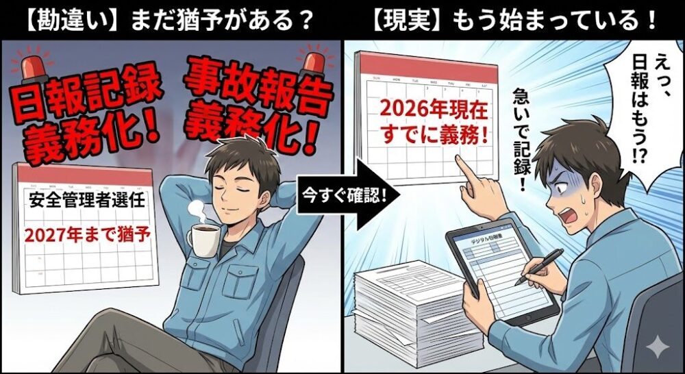 【2026年1月の重要トピック】 既存のドライバーには「安全管理者の選任」に猶予がありますが、「日報(業務記録)」や「事故報告」は、2026年現在すでに全てのドライバーに義務化されています。 「猶予があるからまだ何もしなくていい」という勘違いが、最も危険です。