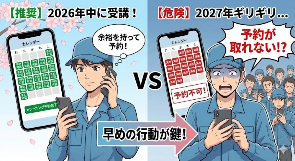 2026年現在、24時間受講可能なオンライン講習(eラーニング)も整備されています。仕事の合間に自宅で受講できるため、早めにスケジュールを確保しましょう。